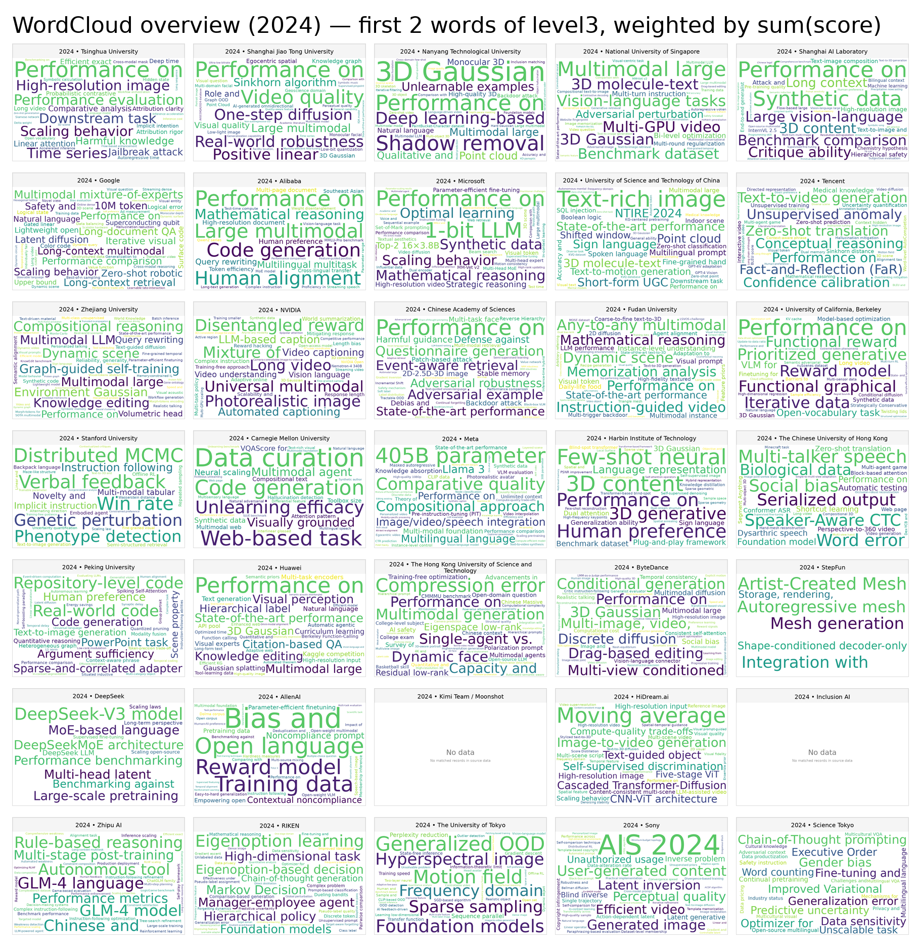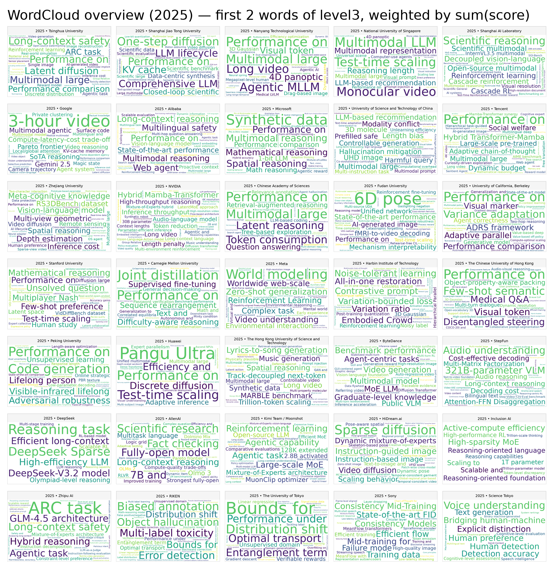 極特化型:DeepSeekはLLM+RL+Evalの3テーマだけで構成され、reasoning・attentionへの集中度は全機関中最大。HiDreamはGenAI/Video 63%と完全な diffusion/media 特化だ。